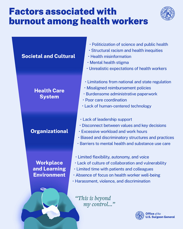 A Surgeon General’s report on healthcare worker burnout issued in 2022 itemized a range of contributors to burnout. According to Drs. Giordano and Schimmels, these come down to several key drivers. In addition to excessive workload, central factors include: